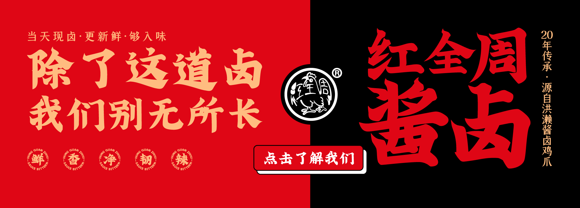 紅全周品牌創立于2012年,其生產總部坐落在以“紅全周雞爪”聞名的福建泉州市南安洪瀨鎮,經張福來師傅多年研制而成的獨家秘方,獨特的鹵制工藝,以“鮮、香、韌、辣”的特點,贏得廣大食客的交口稱贊。紅全周繼承中華美食傳統,堅持以“細微處見風范,毫厘間定乾坤”的服務準則,遵循現代健康飲食理念,精選上等食材,致力為消費者提供安全、健康的美食新體驗。